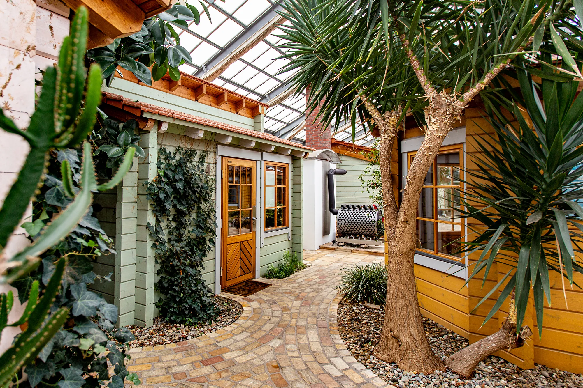Unter einem 650 qm fassenden Überbau aus Glas haben wir „unseren IQ-Standort“ entstehen lassen: In finnischen Blockhäusern befinden sich unsere Büros. Moderne Baustoffe wie Holz, Glas und Stahl, in Kombination mit einer natürlichen Umgebung aus Pflanzen und einer Teichanlage.