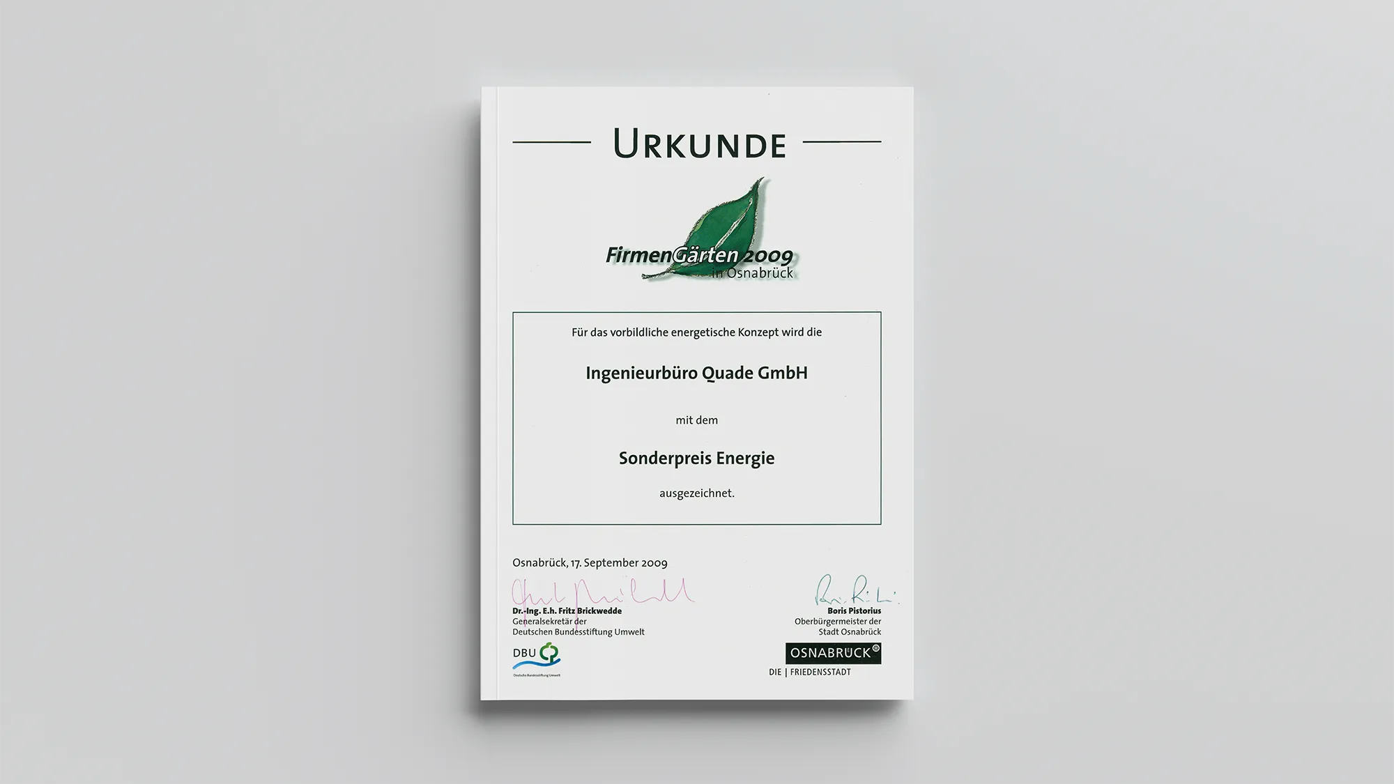 Bereits 2009 sind wir von der Bundesstiftung Umwelt im Bereich Firmengärten mit dem „Sonderpreis Energie“ ausgezeichnet worden.